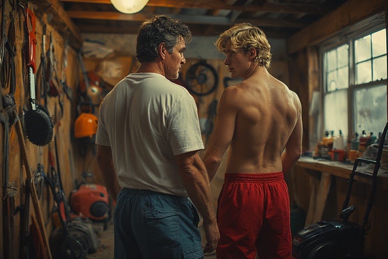 Jeremy turned on his heel and headed for the front door. Five minutes later, he had Brandon with him. Brandon was wearing snug-fitting, red rugby shorts and carrying a towel.